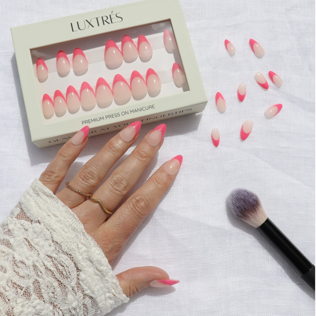 Enter the fun sister! This style is a lot of different things but they are certainly not a conventional take on a French manicure. French Flamingo in Short Almond will never take a back seat and will never be understated. They have arrived for the party and your invited. They have a pale pink base and a generous hot pink tip along the top. This manicure looks perfect sipping a spicy margarita on a night out or savouring a black coffee the next morning. Made from salon grade gel, our strong premium press on nails and our even stronger glue will have these nails stay in place for as long as you need them to be. This style comes in an extra wide size, ensuring that you will have maximal coverage for a salon perfect manicure. Be bold, be confident and make a statement with French Flamingo in Short Almond. Shop French Flamingo as part of the Short Or Sweet Bundle.