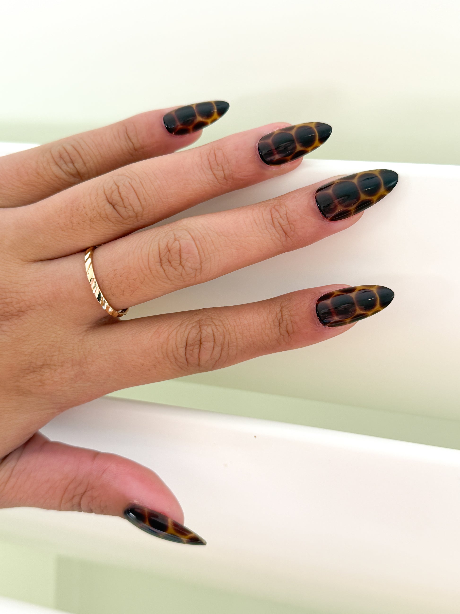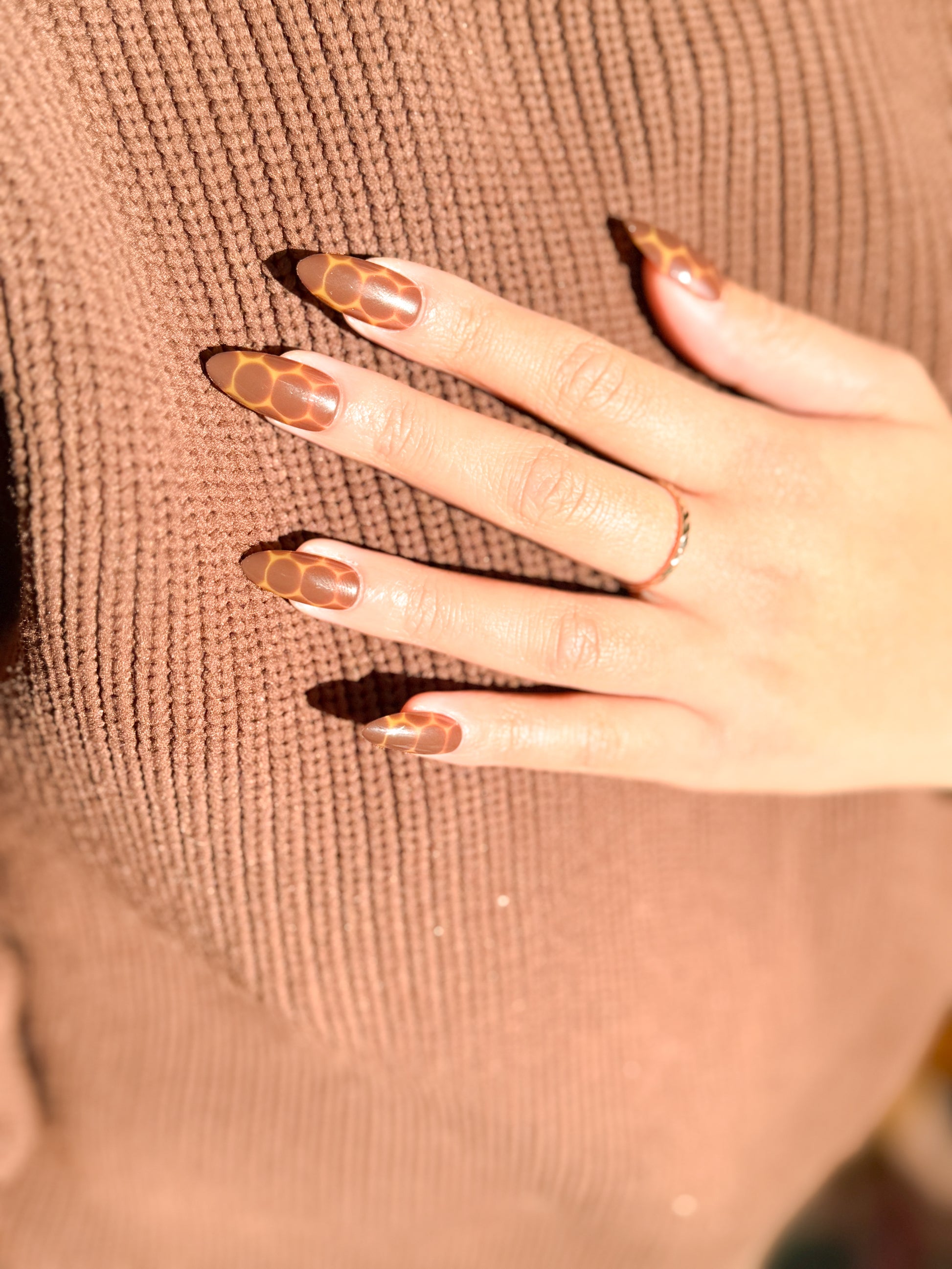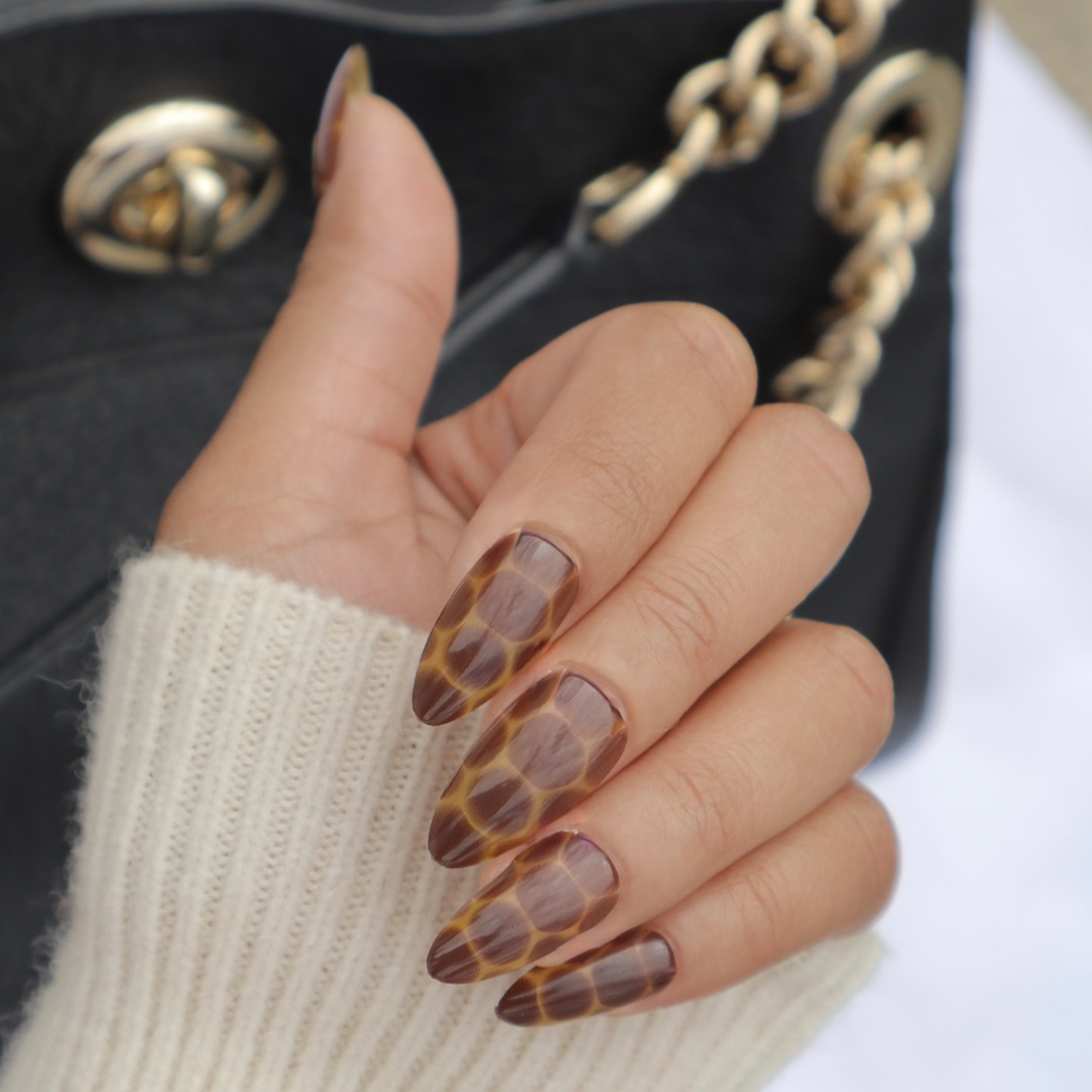 It's a style that's sure to turn heads and make a statement. With a warm caramel base and dark brown irregular shapes delicately layered with a slightly transparent finish, these nails give a tortoise shell effect. Not only is it a unique look, but the slightly transparent finish adds depth and dimension when viewed in different lighting. This elongated, almond-shaped design exudes confidence and control. Pair it with luxury accessories for a polished and put together look or dress it down at your next brunch, your manicure will speak volumes about your impeccable taste.